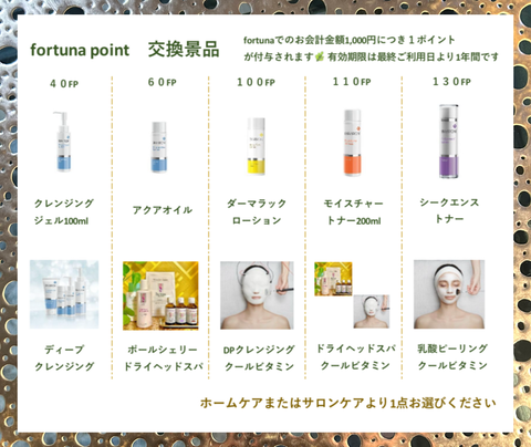 スキンケアサロンfortunaにてエンビロン化粧品をご購入いただくと、「1,000円につき1ポイント」が貯まります。ポイントは1年間有効となり、40ポイントから交換が可能です。